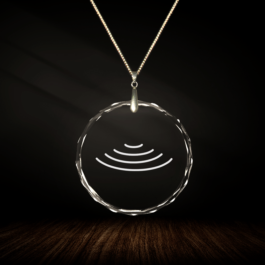 Lovely and high-quality round glass pendant with faceted edges and crystal ATOROS lasered inside. The ATOROS pendant was energetically cleaned and then energized together with the spiritual world with the energies of the crystal.